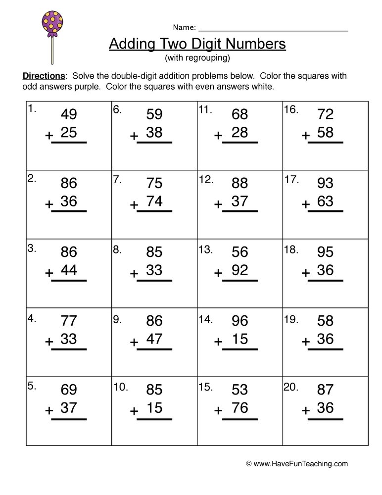 10 Double-Digit Addition Worksheets With Regrouping - ThoughtCo These two-digit addition worksheets will give your students the practice they need to master regrouping. Click on the hyperlink to download the pdf and print out the pages for use in your classes. Each worksheet includes 20 double-digit addition problems, a number line, and a second page with the answers. 01 of 10 Worksheet # 1